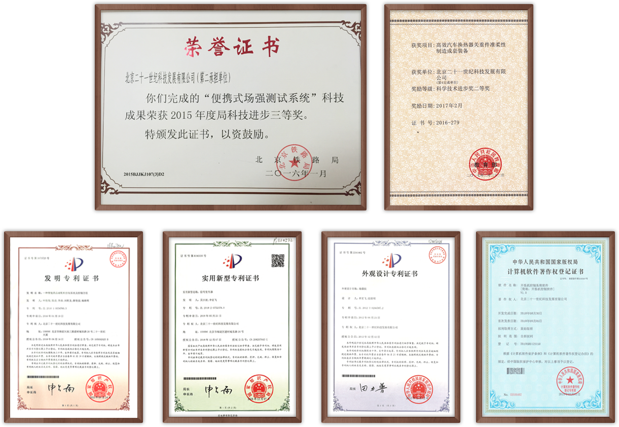 公司自成立以來,堅持科技引領(lǐng)發(fā)展,專注研發(fā)創(chuàng)新,現(xiàn)已擁有國家專利20余項,軟件著作權(quán)50余項。公司承擔(dān)并成功實施的“高效汽車換熱器關(guān)重件準(zhǔn)柔性制造成套裝備”項目獲得教育部科技進步二等獎。自主研發(fā)的“便攜式場強測試系統(tǒng)” 榮獲北京鐵路局局科技進步三等獎。